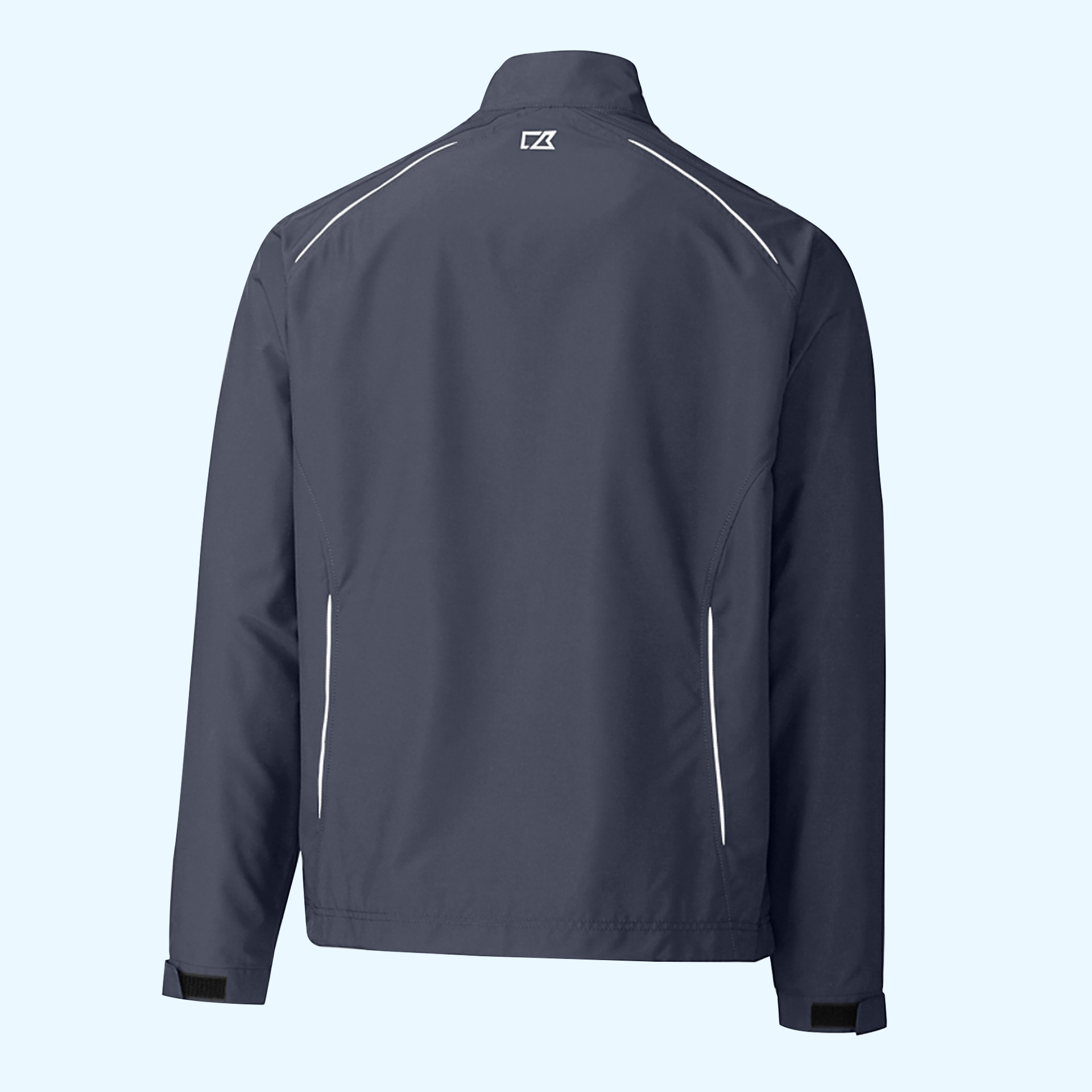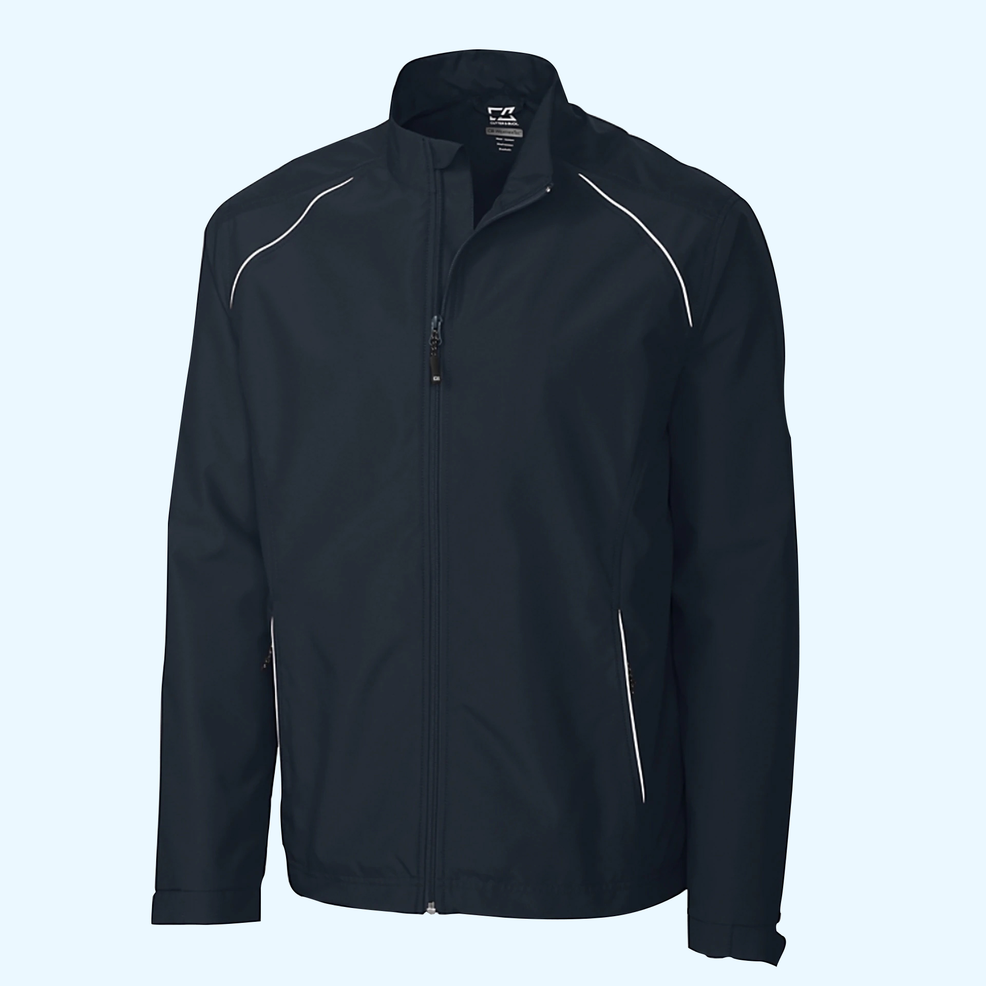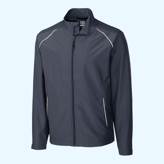 Enjoy water-repellancy and breathability with this mock neck, full-zip jacket. Fully lined for added comfort and protection, this coat shields you from the elements without missing any fashion cues. The zipper is placed inside the lining for embroidery access.