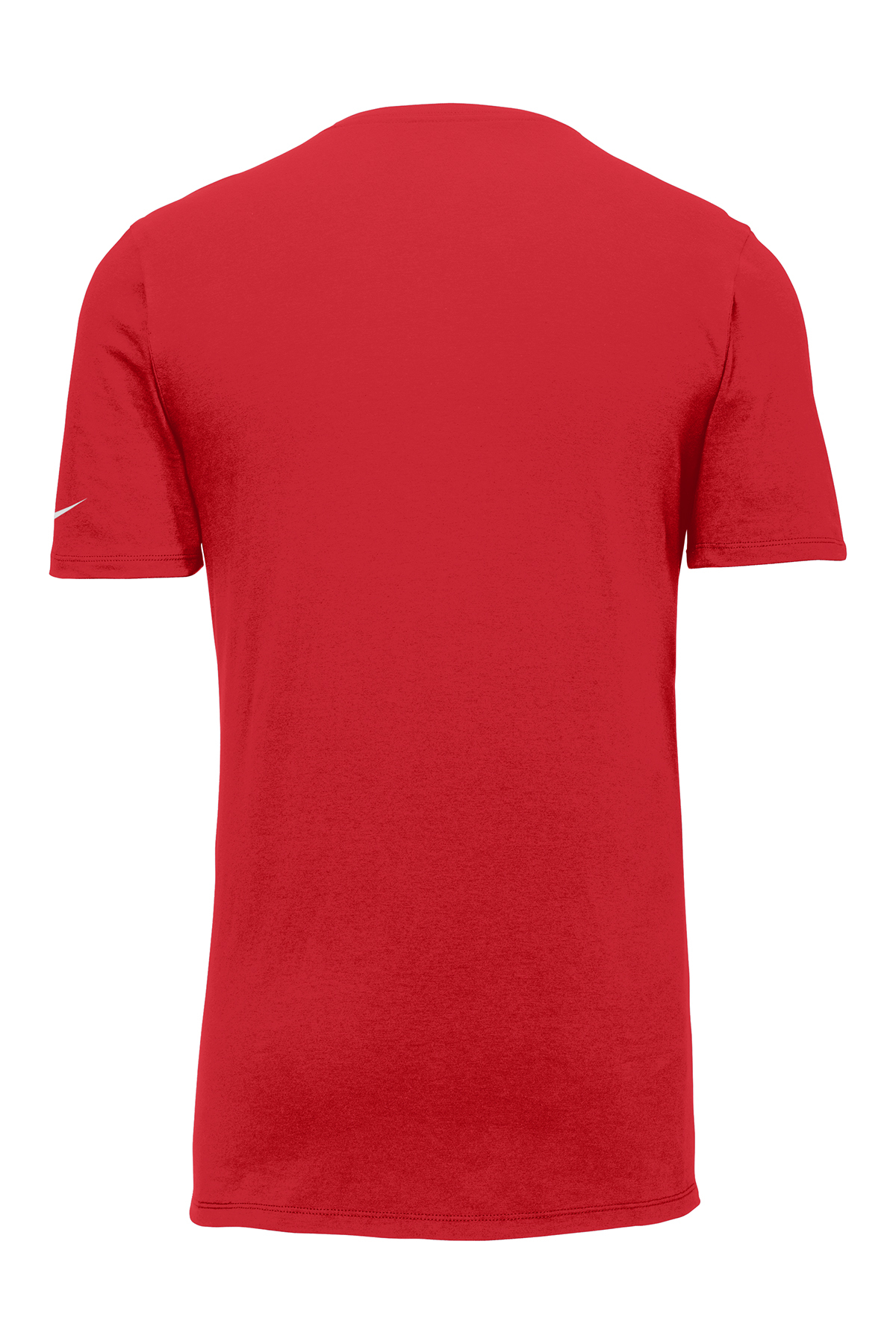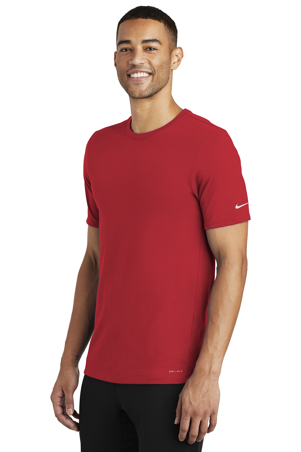 This Nike performance tee features sweat-wicking fabric to help keep you dry and comfortable. Durable rib knit crew neck. Heat transfer label for tag-free comfort. Double-needle stitching throughout. Contrast heat transfer Swoosh design trademark on left sleeve. Contrast heat transfer Dri-FIT logo at right hem. Made of 4.7-ounce, 60/40 cotton/poly Dri-FIT fabric.