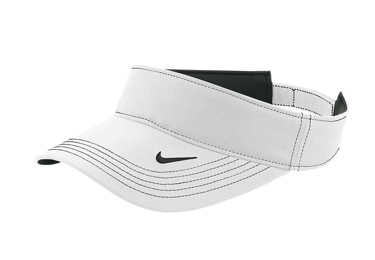 A high-performance, three-panel visor built with Dri-FIT moisture management technology. Contrast stitching adds interest, while the hook and loop closure ensures a custom fit. The contrast Swoosh design trademark is embroidered on the bill. Front panel measures approximately 1.875 h x 10 w. Made of 100% Dri-FIT polyester twill.